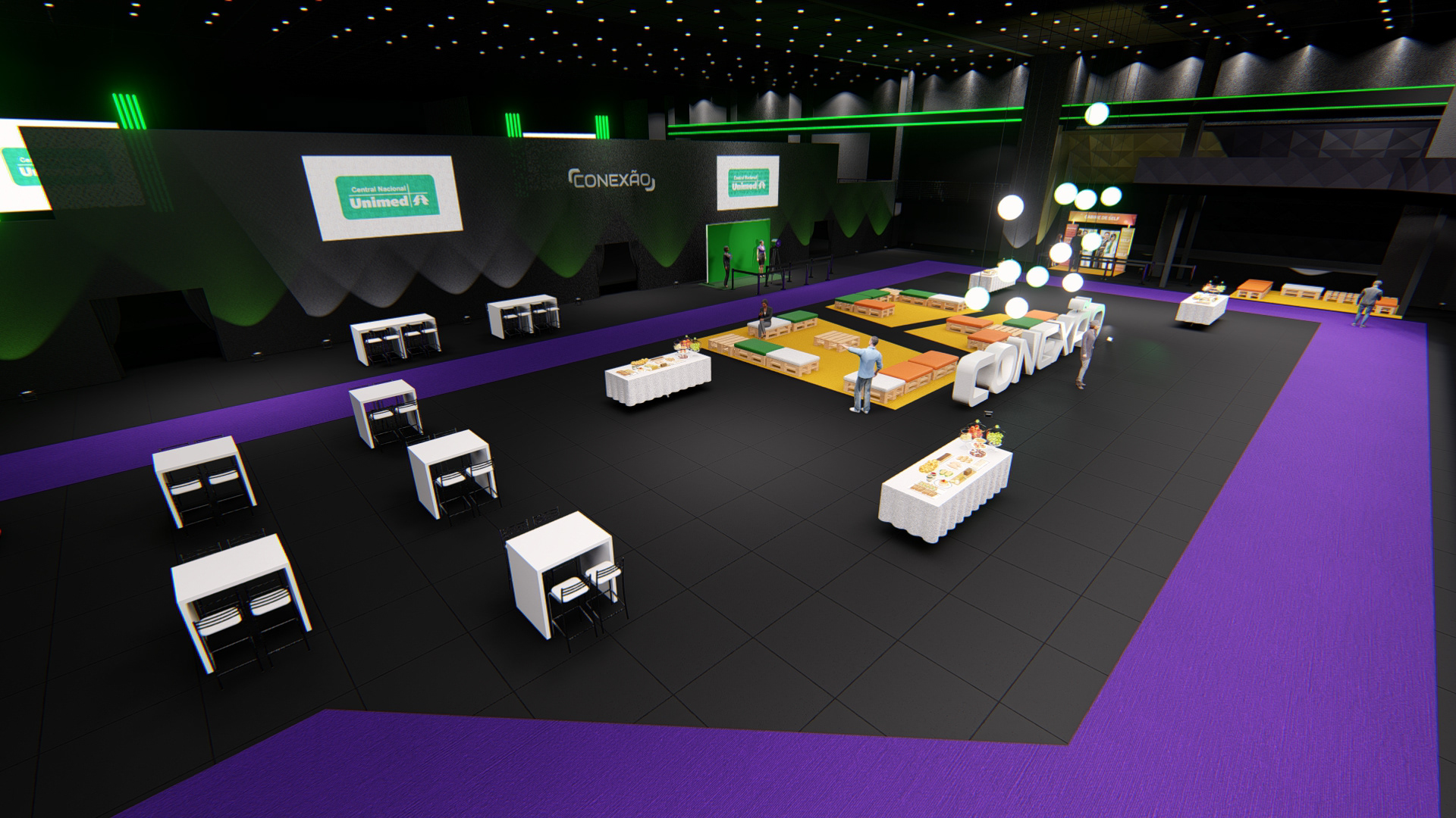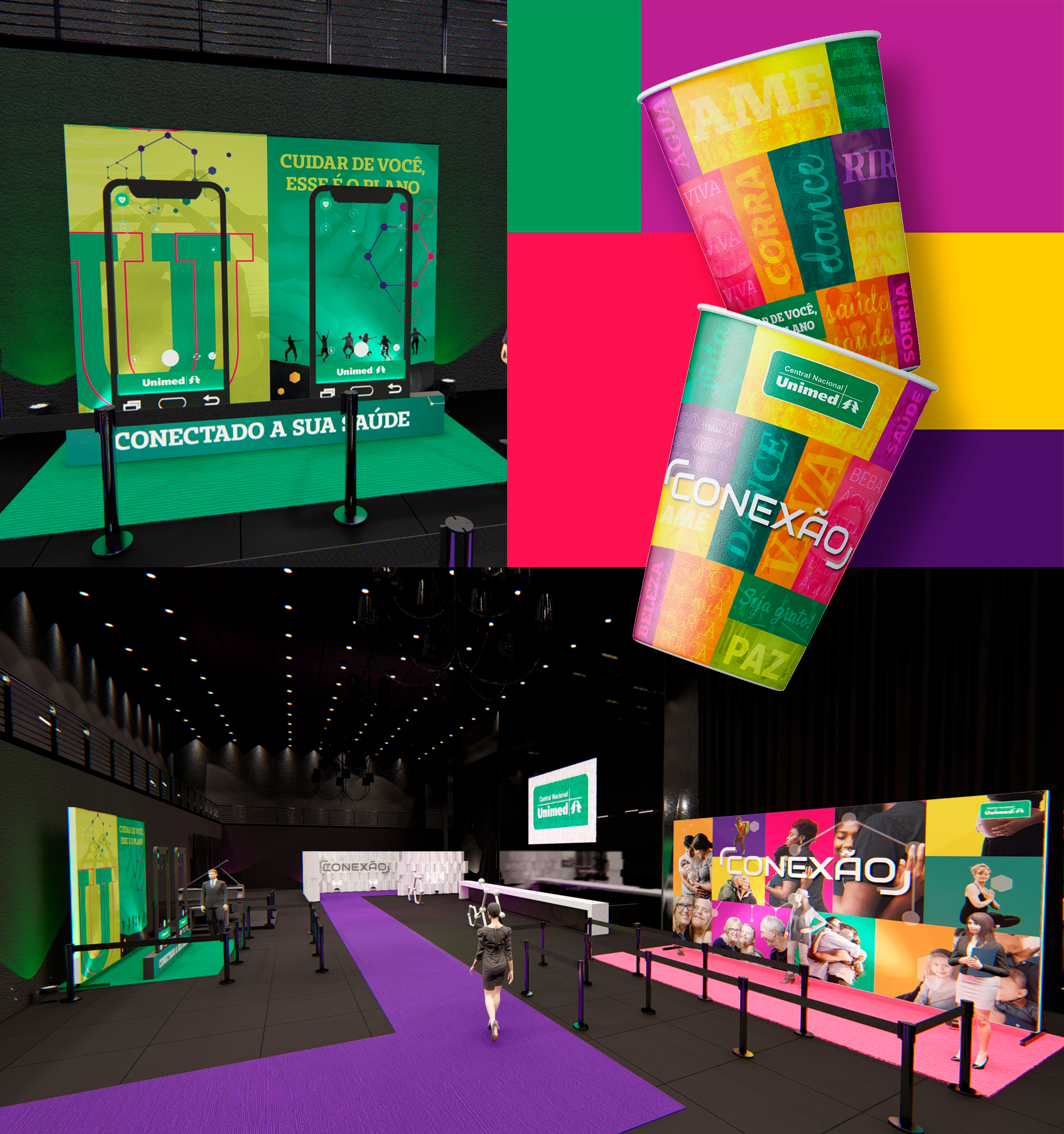 Event for Unimed on technology and medicine. The connection, between technology and humans, enabled an innovation in the entire work process of the Unimed team. In these projects I participated in the entire creation area. I realized the identity of the event, logo, set design and promotional materials. I also assisted in the planning of the event's scenography together with the architects Alessandra Sanches and Juliana Sumita, in which they realized the 3D renders of the project.